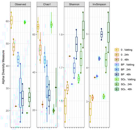 Boxplot of α diversity by four indices based on the taxonomic assignation of high-quality 18S rDNA reads of fungi from must samples at prefermentary stages (treatment: without SO2 (0), SO2 (SO2), bioprotection (BP); stages: vatting, 24 h, and 48 h prefermentary maceration.