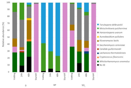Levels of the total yeast population by plating method on LT medium are given in Table A4. Total yeast populations were from 8.3 × 102 to 2.3 × 103 CFU/mL for the vatting stage, except for the bioprotection treatment where the population was logically higher (3.4 × 105 to 4.8 × 105 CU/mL) due to non-Saccharomyces addition. Total yeast populations were generally stable during the prefermentary stages and reached 7.7 × 106 to 4 × 107 at the beginning of the alcoholic fermentation. A total of 60 colonies per treatment and 180 colonies per stage (4) were isolated from LT medium and subcloning on YPG medium, resulting in 683 clones to be analyzed by MALDI-TOF MS for species identification (Table A4), instead of the 720 planned. Five isolates did not grow after subcloning and only eleven isolates were isolated from one sample, and this sample was therefore not considered for further analyses. Some isolates (26) were not identified as their profiles did not find a match in the database and, finally, 657 isolates (95%) were identified successfully at species level by MALDI-TOF MS, among which were ten different species (Figure 5). Metschnikowia pulcherrima, Torulaspora delbrueckii, Aureobasidium pullulans, and Hanseniaspora uvarum were previously reported as OTUs by HTS, whereas Kluyveromyces lactis, Saccharomyces cerevisiae, Whickerhamomyces anomalus, and Lachancea thermotolerans were identified among the “Others”. Candida guillermondii and Cryptococcus flavescens were not identified by HTS. As for the Q-PCR analysis, only Metschnikowia pulcherrima was detected with SO2 or without SO2 (0) treatment as part of the indigenous population, with a higher percentage without SO2 at vatting and 24 h of fermentation (24 h).