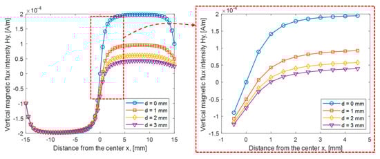 From the results in Figure 3, it is possible to estimate the relationship between the Hy and d by a quadratic equation, as shown in Equation (6). Here, α1, α2, and α3 are constants. On the other hand, when using the Hall sensor, the magnetic flux density in the vertical direction can be measured by the Hall sensor output voltage VH, as expressed in Equation (7) (relative permeability of the air is assumed to 1):