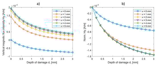 (a) Relationship between the depth of damage d and the vertical component of magnetic flux intensity Hy and (b) the normalized Hy at different positions from the yoke’s center in the x-axis.