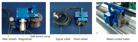 Figure 5 shows the proposed magnetic leakage testing system to inspect the corrosion in the water-cooled tube wall. A magnetic sensor array and magnetizer were manufactured to fit with the water-cooled tube’s surface, as shown in the left and middle drawing. The magnetic sensor array was placed at the middle of magnetizer poles for measuring the distribution of vertical magnetic flux, as discussed in the previous paragraphs. There were three wheels (a front and two rears wheels) used to maintain the lift-off between the sensor and the tube and help scan the tube easily.