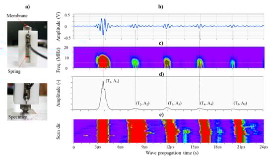 A sample flexible transducer is shown in Figure 6a. The transducer has a spring that keeps the contact between the membrane with the test specimen during the scan. The received time-domain signal of the transducer, which is A-scan signal (u(t)), is shown in Figure 6b. For a better signal-to-noise ratio, the spectrogram of the A-scan signal was processed (S(τ,f)) and extracted only the signal (SA(τ)) at the center frequency of the transducer (fc), as shown in Figure 6c,d. The spectrogram (S(τ,f)) and extracted signals (SA(τ)) are calculated as expressed in Equations (10) and (11), respectively; where, h is a sliding Gaussian window. The extracted signal (SA(τ)) was then stacked to form the B-scan signal while scanning the transducer along with the test specimen.