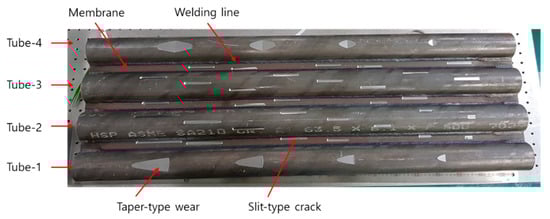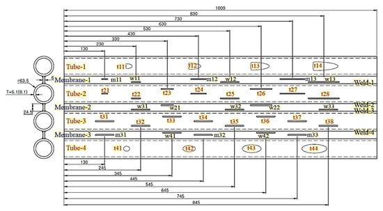 The tubes were welded with a 6.0 mm thick membrane. There six slit-type artificial damages (w11, w12, w13, w31, w31, w33) on the two Membrane −1 and −2. The damages have the same width of 7.0 mm, different lengths from 20 to 80 mm, and different depths from 0.3 to 2.4 mm, as shown in Table 3. On the four welding lines (Welds 1, 2, 3, and 4), there are ten slit-type artificial damages (w11–w42) with the same width of 7.0 mm, different lengths from 30 to 100 mm, and different depths from 0.6 to 3.0 mm, as shown in Table 4. Totally, there are 40 artificial damages produced on the tubes, membranes, and welding lines. The picture of the specimen with damages is shown in Figure 9.