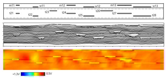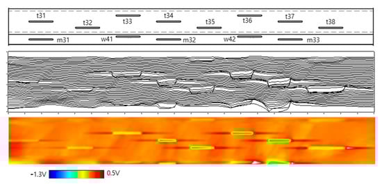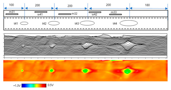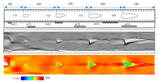 Figure 11 shows the scan results of the MFLT module on the Tube-1. Magnetic field distribution around the damages could help to recognize the presence of the damages. All the taper-type wears (t11, t12, t13, and t14) could be detected, and the magnetic field intensity increases as the size of the wear increases. In addition, the slit-type damages on the membrane (m11, m12, and m13) could also be detected, but the damages on the welding line (w11, w12, and w13) were out of the sensing area. The smallest slit-type damage (m11) has a length of 20 mm, depth of 0.9 mm, and 7 mm width that could be detected. Similarly, the taper-type wears on Tube-4 (t41, t42, t43, and t44) could be detected, as shown in Figure 12. However, the smallest size of slit-type damage on Membrane-3 (m31) having a length of 60 mm, depth of 0.3 mm, and width of 7 mm could not be detected; this is because the damage has a smallest depth of 0.3 mm. The damages (m32 and m33) which have depths of 1.2 mm and 2.4 mm, could be detected. The slit-type damages on the Weld-4 (w41 and w42) were out of the sensing area, but a part of the w42 signal could be measured because the damage has the deepest depth of 1.8 mm.