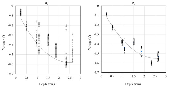 Figure 15 shows the graph showing the relationship measured data with the depth of the defect on Tube-3. The damages have the same width of 7 mm and length of 60 mm. The measured data is the minimum data points selected from the numbers of Hall sensor array that are on the damages during the scan. There are 30 sensors, and 15 sensors data plotted on Figure 15a,b. The data in Figure 15a has more noise than in Figure 15b because some sensors are located far from the damages. Then, data of 15 sensors is used for further evaluation of the damages’ depth. The average data of the sensors are used to reduce noise that may occur rather than a single sensor. Also, the relationship between the measured data with the damages’ depth is expressed in Equation (13). This form of the experimental equation is same as the theoretical analysis by the dipole model of the previous section (Equation (9)). The factors c1, c2, and a2 are 121.08, 6.65, and 2.52, respectively.