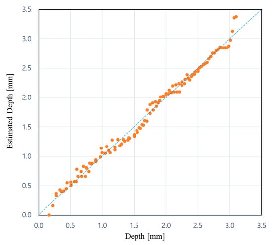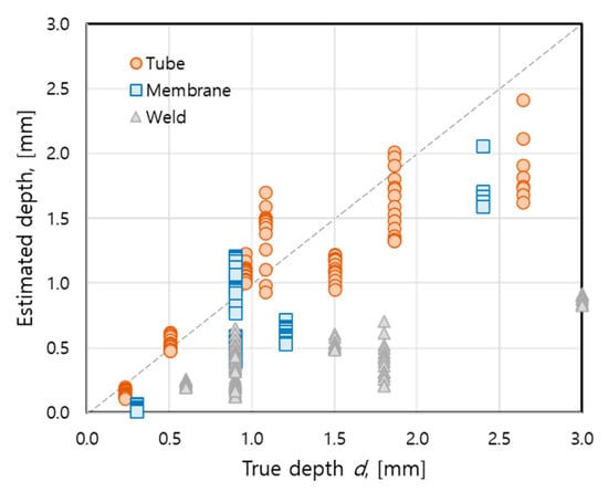 From Equation (13), the depth of damages on the tube (○), membrane (□), and weld (Δ) were estimated, as shown in Figure 16. The standard deviations of the depth estimation are 0.329, 0.269, and 0.523 mm for the damages on the tube, membrane and weld, respectively. The best estimation result is for damages on the membrane because the surface specimen is flat. The worst case for the damages on weld were due to the roughness of the weld surface, the sensor lift-off variation due to welding bead, and the edge effect at the terminal of the magnetizer.