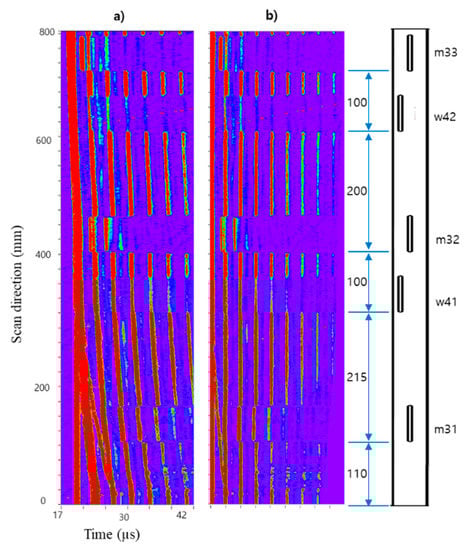 Figure 17 shows the B-scan result measured by the FUP after filling the acoustic medium and wrapping it with PET to the damage of Tube-1 (t11~t14). The horizontal axis represents time (Ti), and the vertical axis represents the moving distance of the FUP. The position of T1 for each movement distance was about 20 µs before the start of the scan, but after 550 mm, it appeared at 17–18 µs. This is because of the variation of the inclined angle of the FUP and deformation of the membrane due to variation of the FUP lift-off. Therefore, it is necessary to shift the flying time on specimen surface (T1) for each scan position, as expressed in Equation (14). Furthermore, it can be seen that in the vicinity of 100, 300, 525, and 725 mm, the delay of the FUP signal is longer than that of other locations, and near-side damage occurs in the corresponding region. It can also be determined from the delay of the signal that the shape of the damage is inclined to one side, and the depth can be estimated.