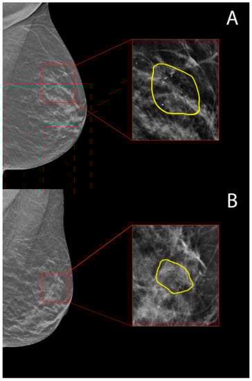 Figure 1A,B shows, as representative examples, two ROIs manually segmented by the expert radiologist on two different DBT images for two calcifications then diagnosed as a malignant lesion and benign cancer lesion, respectively, at their histopathological reports (DBT-guided VAB).