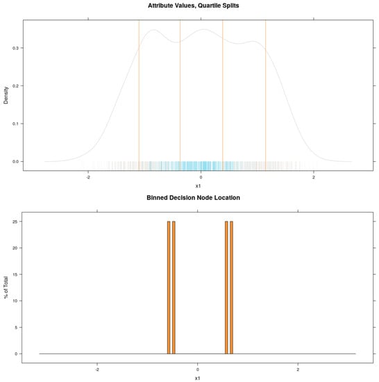 This idea is illustrated in Figure 2. In this toy example, the data set shown has one feature, and two classes. The negative class − (blue) is found mostly around the middle of the range of and is completely enclosed by the positive class + (grey). A GBT model is trained for 1000 iterations using decision trees with , allowing each tree to find two boundary values. The effect of having a freshly perturbed training distribution on each iteration is that each decision node represents a sample from the approximate locations of the optimal boundary values. The resulting decision node boundary values are binned with a simple histogram function. Thus, it is possible to find a very small number of near optimal boundary values to include in the explanations, removing the aforementioned unique value problem. It is clear from Figure 2 that the decision boundary bin medians of the model (shown in the lower panel) align very closely with the cluster boundaries. On the other hand, quartile bin medians that sit half-way between the quartile boundaries (superimposed on the kernel density plot, top panel) tend to split clusters in half or simply appear at arbitrary locations relative to the distribution. This simple example demonstrates that preprocessing by quartile binning does not lead to optimal candidate boundary values for the explanations while gbt-HIPS’s post-processing binning does.