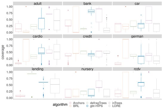 The nine data sets selected for this study have been carefully selected to represent a mix of binary and multi-class problems, to exhibit different levels of class imbalance (no artificial balancing will be applied), to be a mixture of discrete and continuous features, and to be a contextual fit for XAI (i.e., credit and personal data) where possible. The data sets are detailed in Table 3. All are publicly available and taken from the UCI Machine Learning Repository [36] except lending (Kaggle) and rcdv (ICPSR; https://tinyurl.com/y8qvcgwu (30 October 2019)). Three of these data sets (adult, lending and rcdv) are those used in [22] and, therefore, align with precedents and provide direct comparisons to state-of-the-art methods Anchors and LIME. The exceptionally large lending data set has been subsampled. The number of instances in the original data set is 842,000 and was downsampled to for these experiments. Training and test data sets were sampled without replacement into partitions of size 70 and 30% of the original data set.