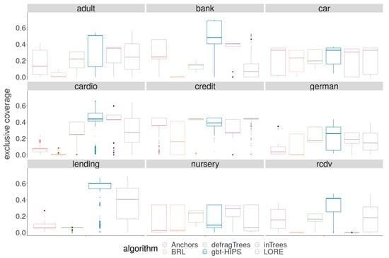 A cursory visual inspection the coverage (Figure 3) does not reveal any obvious pattern. While there is no overall winning algorithm for coverage, BRL and inTrees are each strongly in the lead for three out of the nine data sets, and gbt-HIPS for two of the remaining three data sets. On the other hand, visual analysis of the exclusive coverage score distribution (Figure 4) shows that gbt-HIPS is often leading or a close runner-up. The lead that BRL had for simple coverage is completely forfeit. In fact BRL has the lowest exclusive coverage for five out of nine data sets. Furthermore, the inTrees method no longer has the lead in any data set, except for nursery under the exclusive coverage measure. The tabulated mean and mean ranks of these data (in the supplementary materials) support this visual analysis and show that gbt-HIPS takes the lead for six out of the nine data sets. This result suggests that BRL and inTrees generate explanations that are too general, while gbt-HIPS explanations are robust. This diagnosis is borne out by results from the rule length floor statistic (to follow).