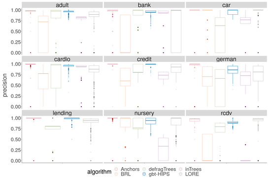 This paper follows exactly the experimental procedures described in [31,32], which adopt a functionally grounded evaluation [37]. The use of this category is well justified because the present research is a novel method in its early stages, and there is already good evidence from prior human-centric studies demonstrating that end users prefer high precision and coverage CR-based explanations over additive feature attribution method (AFAM) explanations [21,22]. The efficacy of CR-based explanations is also already well-established by IML models [7,24,38,39]. Functionally grounded studies encourage large-scale experiments. So, this research will compare the performance of gbt-HIPS with five state-of-the-art methods on nine data sets from high-stakes decision-making domains.