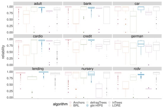 A cursory visual inspection of the precision (Figure 5) demonstrates the trade-off between precision and coverage. The BRL, inTrees and defragTrees methods that had scored relatively well for coverage do not deliver state-of-the-art precision on any data set. Both precision and reliability (Figure 6) score distributions show that Anchors and gbt-HIPS vie for first position over almost all of the data sets. Anchors appears to have a slight advantage for precision while gbt-HIPS appears to do better for reliability. The placement is often so close that it requires recourse to the tabulated results (supplementary materials) and the significance tests to be certain of the leading method.