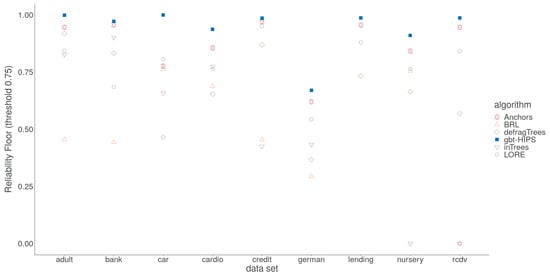 These inconsistencies are, unfortunately, an artefact of the choice of significance test, which is non-parametric and, therefore, insensitive to outliers. Specifically, the long tail of under-fitting instances visible as colour saturated dots in the lower parts of each facet of Figure 6. For gbt-HIPS, instead almost the entire set of scores occupies a narrow band near to the upper bound for reliability. It is for this reason that the reliability floor statistic (Figure 7) is so enlightening. The reliability floor quantifies the propensity to over-fit by measuring the proportion of explanations in the test set that scored above the threshold. Over-fitting explanations are too granular and cover too few instances. Furthermore, a significant number of explanations score zero, demonstrating a critical over-fit. That is, an explanation that covers only the explanandum but not a single instance in the held out set. gbt-HIPS leads on all nine data sets for reliability floor. The reliability floor scores are presented visually in Figure 7 and tabulated in the supplementary materials.