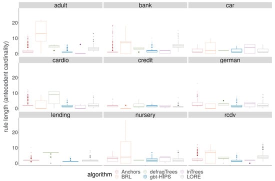 While antecedent length is not an absolute measure, it can be used to compare the relative understandability of CR-based explanations. Significance tests do not form a part of this analysis for the following reason. Even though short rules are the most desirable, a score of zero length (the null rule) is highly undesirable and a sign of under-fitting. The significance test, based on mean ranks of rule lengths (in ascending order) will reward methods with this pathological condition. So, rather than fabricating a new mode of testing, this research relies on the evidence of the visual analysis, and the rule length floor statistic. Anchors and gbt-HIPS are guaranteed never to return a zero length rule via their algorithmic steps. All of the globally interpretable methods, on the other hand, can return the zero length null rule if none of the rules in their list are found to cover the explanandum. It would be highly unexpected for LORE to return a null rule but there is no formal guarantee of this behaviour and, very occasionally, it does occur.