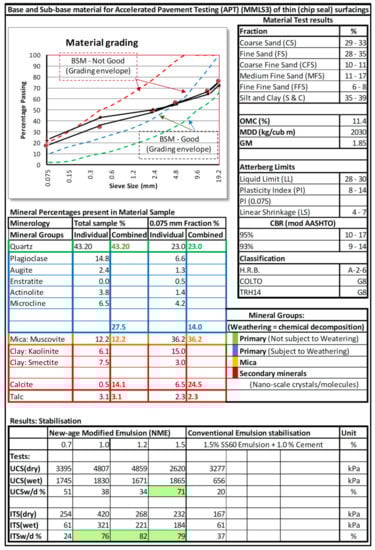The base layer was stabilised using 1.5% of a material-compatible anionic NME stabilising agent. The properties of the naturally available materials used for the construction of the base layer, mineralogy tests as well as the stabilised Unconfined Compressive Strength (UCS) and Indirect Tensile Strength (ITS) (test procedures described in [6]) are summarised in Figure 1. The laboratory-obtained engineering requirements can be compared to the material classification of NME4 as shown in Table 1 [7,23].