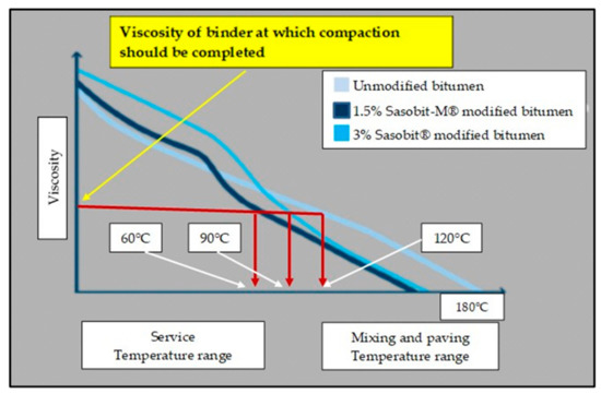 SASOBIT® (Fischer-Tropsch (FT)) wax modifications [30] to bituminous binders were developed more than 25 years ago with well-known advantages, as confirmed all over the world (e.g., [31,32,33]). These advantages included the compaction of asphalt at temperatures as low as 80–90 °C (compared to unmodified binders, where a minimum of 120 °C is the norm). The original formulation of SASOBIT® has recently been improved, with a crude-oil additive to allow for compaction at temperatures as low as 60 °C. This new formulation is known as SASOBIT-M® [34], which also prevents an increase in viscosity at lower temperatures (associated with SASOBIT®). The comparison between the viscosities and compaction end temperatures of standard bitumen, 3% SASOBIT®-modified bitumen and 1.5% SASOBIT-M®-modified bitumen is demonstrated in Figure 3.