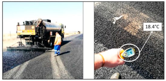 Binder selection as part of any surfacing and the performance thereof in terms of the known parameters of the pavement structure are of importance. The early-life performance of thin chip seals is closely related to strict adherence to weather tolerances during construction (temperature and wet weather) [27,28]. It follows that the performance of thin chip seals is traditionally linked to good quality control during construction. Over and above additional considerations, only the relevant data in terms of this paper are repeated in terms of road surface temperature requirements. According to best practice [27,28], binder application may only be placed under the following surface temperature conditions: