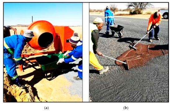 The placement of the SASOBIT-M® tack coat for the 20 mm chips (stone) was done on 25 July 2018, as shown in Figure 4. With the consideration of possible future labour-intensive construction, the slurry part of the Cape seal (Section B in Figure 2) was mixed on-site using a standard concrete mixer and applied to the surfacing by hand in one application, using squeegees (Figure 5a,b). To achieve a working window of 6 h to allow the workers enough time to properly fill all voids and to achieve a smooth surface, the normal anionic NME binder was diluted with water at a 1:2 ratio during mixing with the aggregate. The required dilution of the binder resulted in an equivalent reduction in the required binder content (similar to that found with anionic stabilisation of naturally available materials where the better distribution of the binder through a reduction in particle sizes required less of the stabilising agent to meet the engineering requirements with ease).
