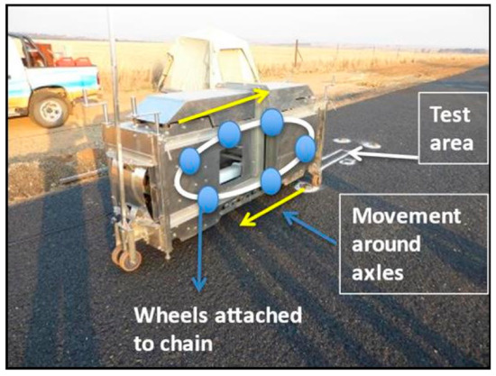 APT loading of the different chip seal sections was done using the Model Mobile Load Simulator—3rd model (MMLS3) [14]. The MMLS3 was specifically developed to test the deformation characteristics of asphalt surfacings for use on highways, with the test procedure and criteria contained in a formal South African National Standard (SANS) [15] specification. The tyre pressures of the MMLS3 are equivalent to those of heavy vehicles commonly found on southern African roads (690 kPa to 850 kPa), and loads are applied on the 300-mm-diameter tyre at 2.9 kN at a rate of 7200 repetitions per hour [14].