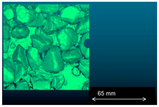For larger aggregate sizes (>10 mm), handheld scanning provides superior angles to cover a larger percentage of the exposed surface area compared to that of a fixed scanning method. A wider range of rotation of the scanner is required to cover all areas and angles. For the Handheld HD Scan setting, an accuracy of 0.1 mm and a point distance of 0.2 to 2.0 mm is obtainable. For adequate coverage, approximately 16 scans were required around the circumference of the sample, with 2 to 3 different pitch angles for 32 to 48 scans. Typically, a point cloud composed of more than 5 million points was found to be indicative of a complete scan. The scanning process takes approximately 20 min per sample. The scans are scaled in the appropriate unit of measurement (millimetres). For samples selected at random locations, the surface area varied by less than 2%.
