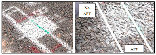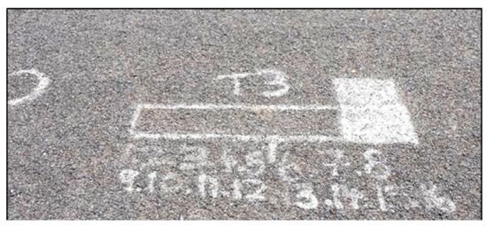 The evaluation was done using high-speed, high-frequency, high-impact APT loading equipment, specifically designed to evaluate the deformation characteristics of asphalt layers for highways [14,15]. Due to the high-speed loading, it was deemed particularly suitable to evaluate possible punching of the chips (stone) into the base layer as well as to evaluate any deformation that may occur within the test area relative to the unloaded area.