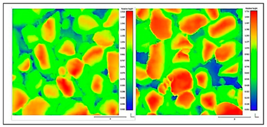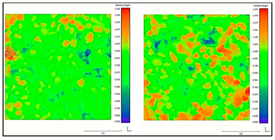 A 3D scan of the surfacing with and without loading: The height maps of the 20 mm seal produced from the 3D scans are shown in Figure 9 (APT loading on the left and no loading on the right). The blue-to-red 3D-generated pictures show the relative differences in height within the scanned areas. The less red in the scan after APT loading is an indication of the reorientation of the stone that has taken place and the filling of the vacant blue areas. The statistical evaluations of the data of the two scanned areas are given in Table 2.