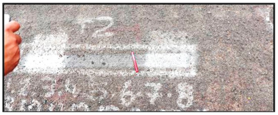 Visual assessment: The demarcated area for the APT loading done on the 20 mm single seal with the area for the 3D scans painted in white is shown in Figure 8. The stone reorientation that occurred on the 20 mm single seal after 18,000 repetitions is clearly visible. No stone loss could visibly be detected on the test section, and no stone penetration into the anionic NME-stabilised base (using unsuitable materials) could be detected.