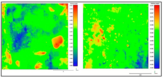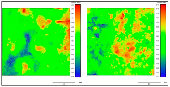Height maps obtained from the 3D scans of the area subjected to APT loading (left) and the adjacent section (right) that received no loading.