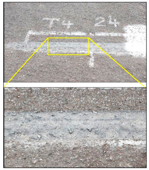 Visual assessment: Figure 10 shows the surfacing of the double seal with and without testing with more than 18,000 repetitions applied at temperatures between 12 °C and 19 °C with the MMLS3. No visible difference between the test area and untested surfacing was detected. No sign of an excess of binder could be detected on any of the test sections, with no sign of bleeding of the binder.