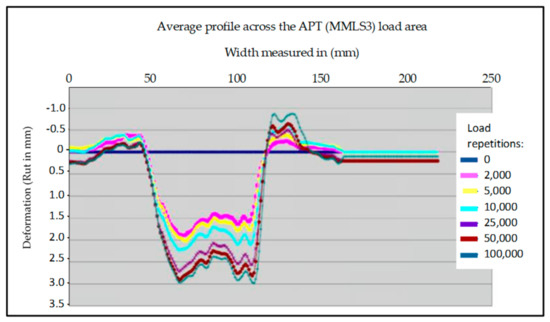 Summary of the rut depth measurements at various positions and repetitions of the standard MMLS3 test (South African National Standard (SANS) 3001-DP1) [15], done on the Cape seal with an anionic NME slurry mix placed on an anionic NME-stabilised base constructed with naturally available materials (Table 1—materials quality G8/A-2-6).