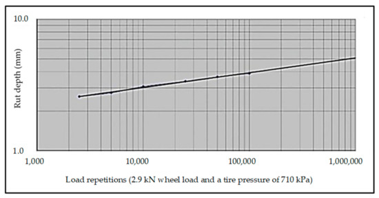 Plot and extrapolation of the average measured rut depth during the 24 h MMLS3 test with 100,000 repetitions done on the Cape seal constructed using unconventional binders.