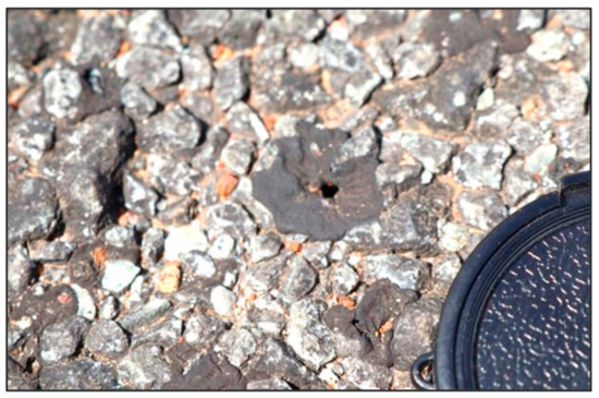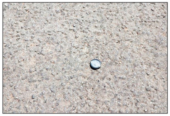 The test section was again visually inspected on 19 March 2020. No traffic has used the test section for 14 months since January 2019. The single seal and the Cape seal (Figure 19) showed no difference. However, closely spaced (about 100 mm apart) small holes were now clearly visible all over the double seal section (Figure 20). These holes showed excess binder visible on top of the surfacing, indicating the forceful escape from the bottom of trapped moisture vapor that popped through the second application of the modified (S-E2) [11] elastomer-(SBS)-modified binder. The size of the holes can be compared to the lens cap of a camera, partially shown in Figure 20. The different novel binder applications used in the Cape seal and the single seal showed no holes, with no visible sign of moisture entrapment.