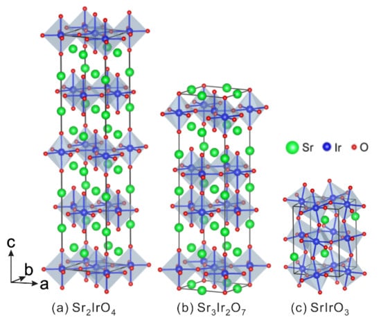 The RP series of iridates SrIrO is a family of materials, with n being the number of SrIrO perovskite layers sandwiched between SrO layers []. Figure 1 displays the crystal structures of the three iridates. SrIrO is a single-layered quasi-two-dimensional (2D) compound for which the symmetry is lowered from to due to the rotation of IrO octahedra along the c axis by about []. Besides rotation, the IrO octahedra is elongated along the c axis, giving rise to a bond length ratio 1.04 []. SrIrO exhibits a similar crystal structure to SrIrO, but it consists of stacking bilayers of corner-shared IrO octahedra along the c axis []. The octahedral rotations for the neighboring IrO octahedra in SrIrO are opposite not only within each layer but also between the two layers (see Figure 1b). The perovskite-like SrIrO is a high-pressure phase and has an orthorhombic three-dimensional (3D) structure [,].