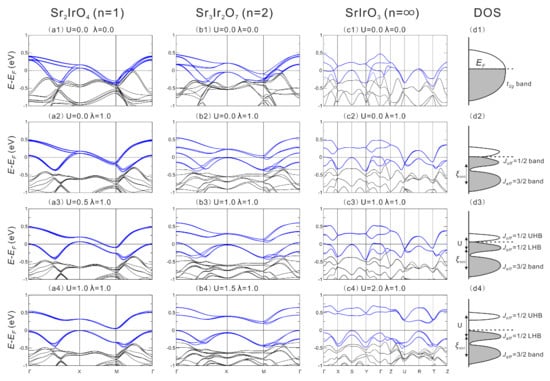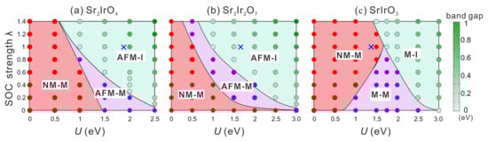 For the RP series of iridates, the spin–orbit coupling, electron–electron correlations, and spin–exchange interactions operate with comparable strengths, and depending on their subtle interplay, different phases can develop. Therefore, it is essential to first study how the interplay between U and SOC influences the electronic and magnetic states as well as the transition from one phase to another. Figure 2 shows the metal–insulator transition (MIT) and magnetic phase diagrams of three iridates as a function of Hubbard U and SOC strength. To characterize the strength of SOC, we introduced a factor in the SOC term of the Hamiltonian. In this way, one can enhance the effect of the SOC by taking 1 or can reduce it by taking 1, where 1 refers to the self-consistent reference value. The phase diagram displayed in Figure 2 show that the cooperation of U and SOC and dimensionality (n) lead to the formation of different phases: (i) In the limit U = 0, all compounds are nonmagnetic metals (NM-M), It can be seen from Figure 2 that, without U (U = 0), the three compounds are nonmagnetic metals (NM-M), regardless of the SOC strength. (ii) In the limit of full quenching of SOC strength = 0, a MIT induced by the electron correlation is only achieved for nonphysically large eV. For smaller U, the systems enter a transient magnetically ordered metal state (AFM-M for and a more complex magnetic-metal state for , generally denoted M-M, which will be discussed later on). (iii) The opening of the gap in the Dirac–Mott insulator, and , is clearly driven by the cooperative action of SOC and U: The general tendency is that, the stronger the SOC strength, the smaller the critical interaction required for opening the gap. For 1, a moderate 1 eV is sufficient to initiate the MIT in the and compounds, whereas a substantially larger value of 2 eV is required for SrIrO (), the only non-insulating member of the considered series. As we will see, the overall predicted ground state, marked by a cross and corresponding to 1 and U set to the calculated cRPA value, is in excellent agreement with expectations for each member of the series. Our calculated phase diagram for SrIrO is consistent with the one reported by Zeb et al. [].
