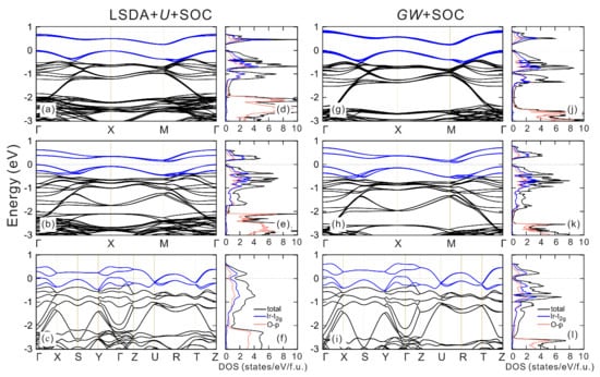 Electronic band structures and density of states (DOS) obtained from (a–f) LSDA+U+SOC with U calculated from cRPA and (g–l) +SOC calculations for three iridates (upper panel for SrIrO, middle panel for SrIrO, and bottom panel for SrIrO). The Fermi energy has been aligned to zero. The high-energy Ir- states are not shown due to the large crystal field. Reproduced with permission from Reference []. Copyright 2018 by the American Physical Society.