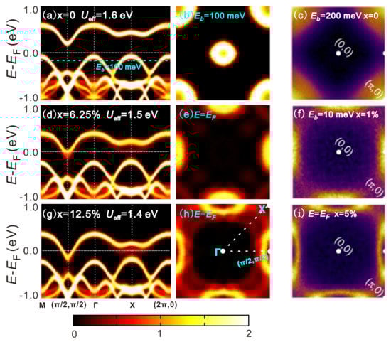 Finally, we would like to mention that the gap in SrIrO is unstable upon doping: both electron and hole doping induce an insulator-to-metal transition associated with the emergence of a Fermi surface [,,]. The basic features of the transition are well captured by LSDA+U []. Figure 6 show a comparison between calculated (middle panels) and experimental (right panels) Fermi surfaces of SrLaIrO for different doping concentrations ( 0, 6.25%, and 12.5%). The Fermi surface are extracted from La-doped supercell using the band-unfolding techniques (left panels), whereas the measured data refer to ARPES. The closing of the gap is attributed to a progressive reduction in the electronic correlation in electron-doped samples and by gradual filling of the bottom of the conduction bands. The agreement between theory and experiment is excellent, apart from the feature at in the simulated undoped Fermi surface due to the overestimation of the top of the valence band at , as previously mentioned.