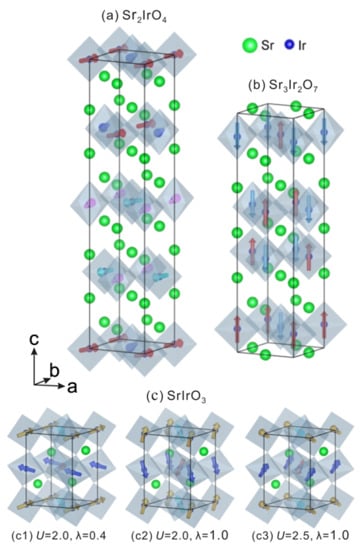Although the magnetic ground state of SrIrO is nonmagnetic, its magnetic ordering in the magnetic regime is more complicated due to its distorted three-dimensional crystal structure (see Figure 1c). As illustrated in Figure 7c, the magnetic ordering depends strongly on U and . For instance, for U = 2.0 and = 0.4, the system shows a canted antiferromagnetic order with a large ferromagnetic component in the plane (Figure 7(c1)). As increases to 1.0, the system becomes a canted A-type antiferromagnet and the moments are largely aligned to the c axis (Figure 7(c2)). Keeping = 1.0 and increasing U (compare Figure 7(c2,c3)), the agenetic moments are aligned in a very different way, but the average magnetization per unit cell is zero.