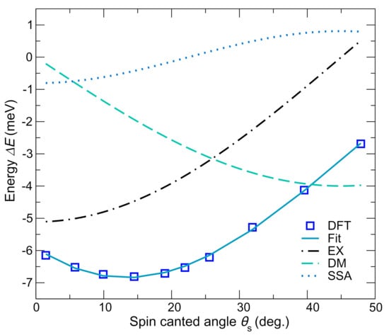 where J, K, and are the nearest-neighbor isotropic exchange, SSA, and DM coupling parameters, respectively, and S and are the magnitude and canted angle of the in-plane spin moment, respectively. Figure 8 shows the spin-dependent total energy as a function of the in-plane spin canting angle decomposed over the isotropic AFM exchange, SSA, and DM contributions. The magnetic coupling parameters can be extracted by fitting the first-principles calculated data using the model Equation (25), yielding = −0.32 meV, K =−0.1 meV, and = 0.25 meV, comparable with available phenomenological data in literature [,]. The AFM isotropic exchange, favoring a collinear alignment of the spins, aids the stabilization of the AFM ordering. The DM interaction, which prefers an orthogonal coupling of the spins, assists the formation of a canted spin arrangement. The SSA is smaller than isotropic and DM interactions but favors in-plane magnetism at small canting angles. As expected, the evolution of the DM and isotropic exchange energies follows a different trend with respect to . The formation of the in-plane canted AFM state at = 14.4 is the result of the subtle competition between these three terms: , , and K.