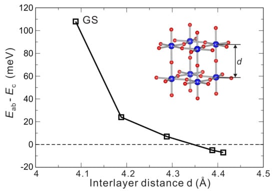 The total energy difference between the -canted AFM and c-collinear AFM phases as a function of the interlayer distance, which is schematically shown in the inset. The ground-state structure is marked as GS.