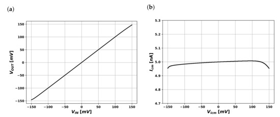 The gate control voltage is exploited to set the output common voltage of the first stage using a common mode feed-forward (CMFF) technique: In the left part of Figure 2, the reference current is mirrored through devices - and applied to - that are a replica of the P-part of the input stage and are diode connected. The gate voltage is applied to the PMOS transistor of the input stage, thus forming a current mirror, and it can be shown (detailed analysis in the Appendix A) that the output common mode voltage of the first stage is set to . The proposed CMFF does not exploit any reference to set the value of the output common mode voltage of the input stage that is determined by the sizing of the devices. In fact, by looking at Figure 2, it is evident that is equal to (-), and therefore, the output common mode is set close to the analog ground for an appropriate sizing of . For example, assuming a dual supply voltage with = 0.15 V and = −0.15 V, can be set to about 0.15 V in order to have about equal to 0 V which in this example is the analog ground.