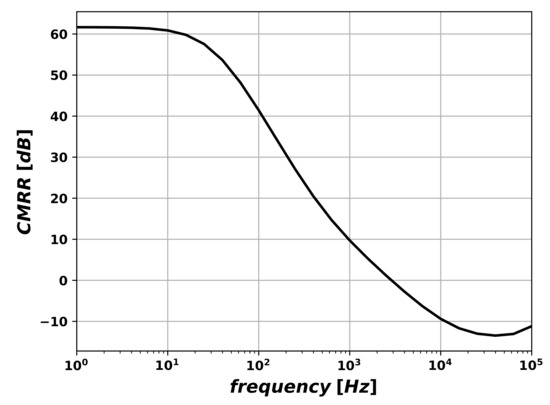 The circuit has been simulated in the Cadence Virtuoso environment to test both open-loop and closed-loop performance. Figure 5 reports the magnitude and phase of the open-loop differential gain: a 64.6 dB dc gain with a 3.58 kHz unity gain frequency and a phase margin of about 54° are achieved in typical conditions. The amplifier has been simulated in a unity-gain buffer configuration to test closed-loop performance. Figure 6a shows the dc input-output characteristic of the buffer, highlighting a rail-to-rail output swing. The bias control loop is able to keep the common mode current of the input stage constant under input common mode variations, as shown in Figure 6b, thus improving common mode rejection and linearity. The CMRR is approximately 61 dB as shown in Figure 7. Supply rejection is around 27 dB, and the amplifier power dissipation is only 11.4 nW.
