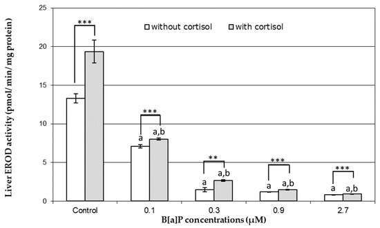 In vitro effects of benzo[a]pyrene (B[a]P) (0.1, 0.3, 0.9, and 2.7 µM) without and with liver microsomal pre-exposure to 5.997 ng/mL of cortisol. Bars represent mean ± SE (n = 4). Asterisks (*) indicate differences between presence and absence of cortisol (* p < 0.05; ** p < 0.01; *** p < 0.001); the letters “a” and “b” indicate differences with control without and with cortisol, respectively.