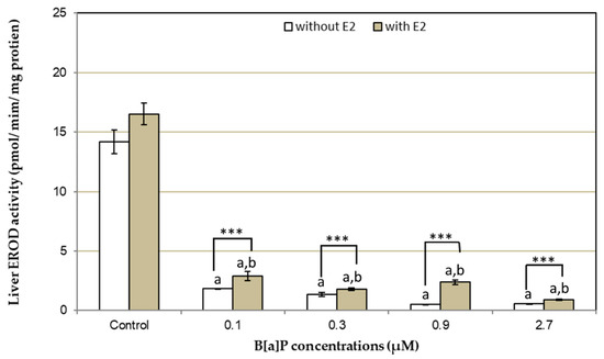 In vitro effects of benzo[a]pyrene (B[a]P) (0.1, 0.3, 0.9, and 2.7 µM) without and with liver microsomal pre-exposure to 5.997 ng/mL of E2. Bars represent mean ± SE (n = 4). Asterisks (*) indicate differences between presence and absence of cortisol (* p < 0.05; ** p < 0.01; *** p < 0.001); the letters “a” and “b” indicate differences with control without and with E2, respectively.