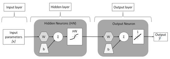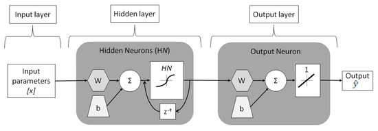 where refers to the k-neuron’s computed value through the use of a certain set of parameters. represents each layer’s neurons’ activation user-selected functions, such as linear or sigmoid function [52], while and are each neuron’s synaptic connections and bias value (respectively), which are fitted through the iterative training algorithm. Further information concerning the neurons’ modeling and their parameters can be found in [49].