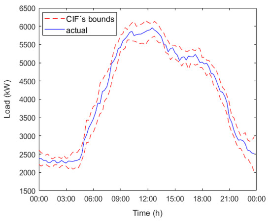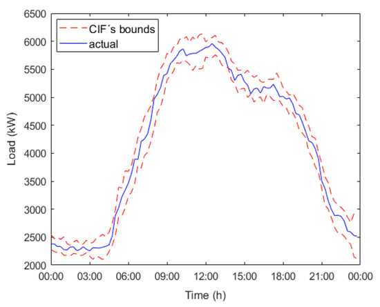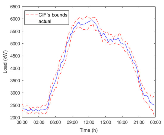 The results presented in Table 11 demonstrate that, with our forecaster and a sensitivity analysis for the parameter, it is possible to obtain IPIFs whose accuracy is close to the stated goal of 95% in terms of the analyzed error rates maintaining interval width. If we focus on the column, it can be seen that the bigger the error rate is, the bigger the value is. This fact does not rely on the predicted interval width; if Equation (22) is examined, it can be seen how is taken into account in computing values, so the higher , the higher . Figure 3, Figure 4 and Figure 5 show the predicted intervals obtained for 8 February 2018 for each examined scenario in Table 11.