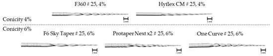 Five endodontic NiTi instruments, two composed of conventional alloys and three made of heat-treated alloys were considered [10,11]. Instruments were digitalized in a micro-CT scanner system (BrukermicroCT, Kontich, Belgium) and irradiated with an x-ray beam at 90 kV and the camera resolution was set at 9 μm·pixel−1. Scans were acquired by revolving the specimen at a 1° rotation step, thus, obtaining 360 projection images. The 3D model of the instruments was reconstructed by assembling (approximately) 700 cross sectional images. Briefly, image datasets were processed via ScanIP® (3.2, Simpleware Ltd., Exeter, UK). Image segmentation and filtering procedures were used and a stereolithography model (STL) of the instruments was created.
