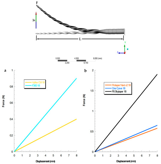 The second loading condition was the torque during the rotation. Thus, indications of the maximum torque according to each manufacturer were used (Table 1). Figure 3 represents both forces in the instrument at the same time.