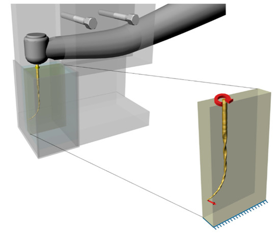 Two different loading conditions were considered for each instrument at the same time (Figure 2 and Figure 3). The first condition representing the bending moment during the insertion of the endodontic instrument inside of the curved canal is shown in Figure 2.