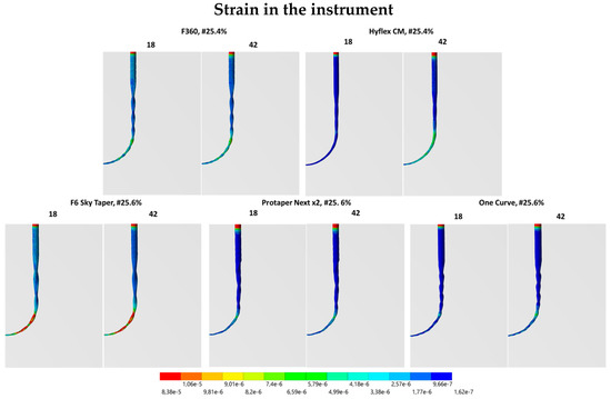 Strain distribution for each instrument according to the values of the elastic modulus of canal dentine (18 or 42 GPa).